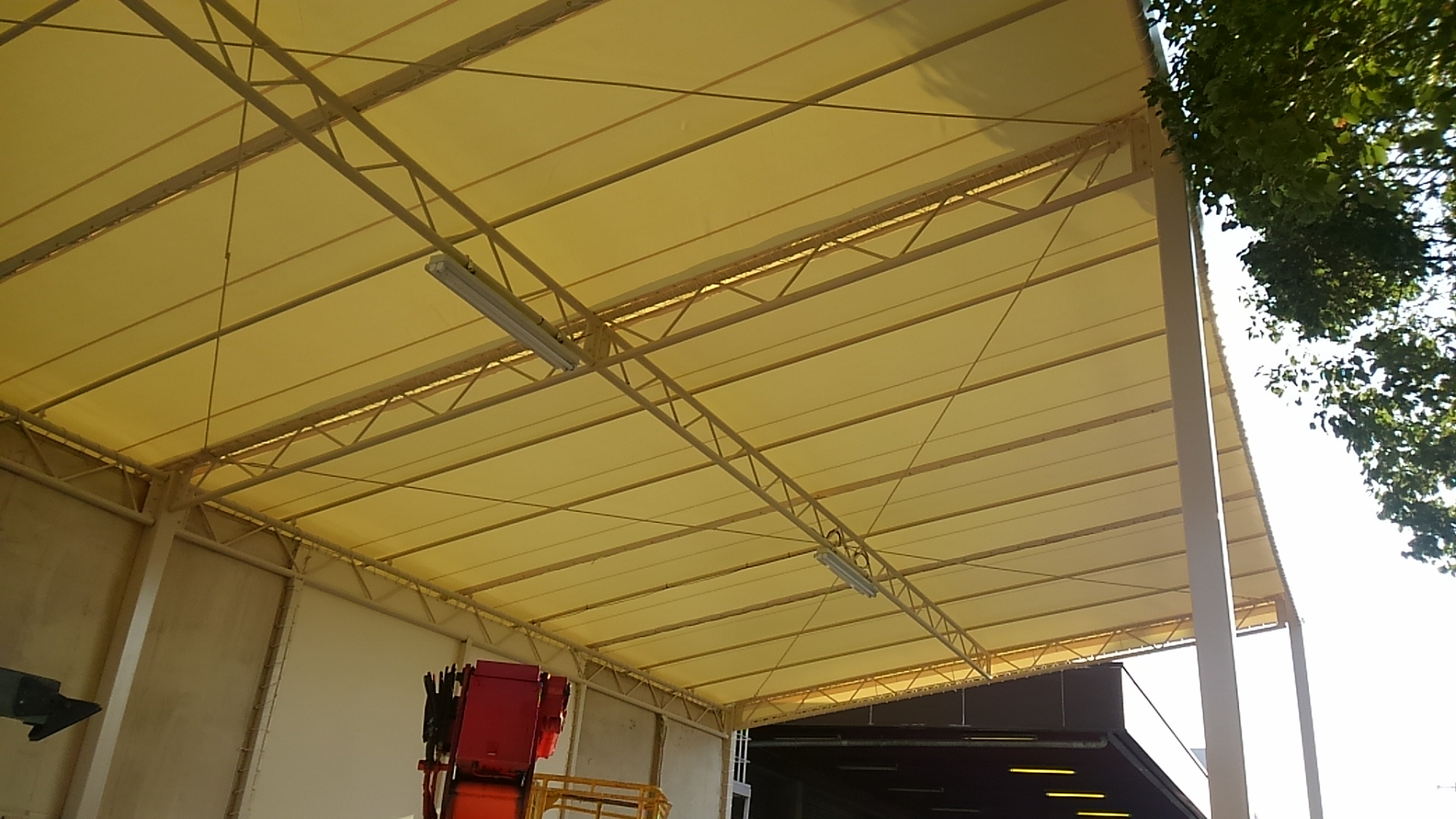 テントの生地色は以前もアイボリー色を選定されておりましたが、この色は採光性が良くて張替えたては特に中が明るく、視認性が上がり作業環境も良く感じます。